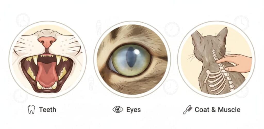 - Muscle Tone: Younger cats are muscular and sleek. Older cats may have more prominent shoulder blades or “bony” backs as they lose muscle mass.